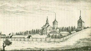 Усть-Киренский Троицкий монастырь на литографии XIX века