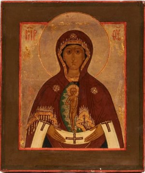 Этот чтимый образ прославился в Приамурье в XVII в. в период освоения русскими Даурской земли. Композиционно икона относится к типу «Оранта», причем Богомладенец здесь изображен в полный рост в препоясании; правая рука Его прижата к груди, левая опущена вниз.