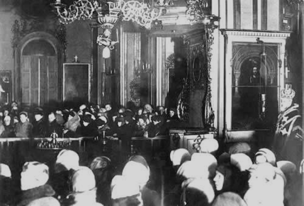 Митрополит Ленинградский Алексий возглавляет Пасхальное богослужение в Николо-Богоявленском соборе в 1942 г.