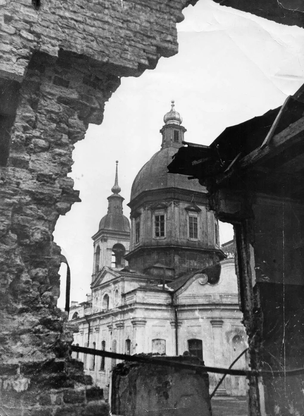 Свято-Пантелеимоновский храм. Вид через пробоину разрушенного дома № 11 по улице Пестеля. 1943 г.