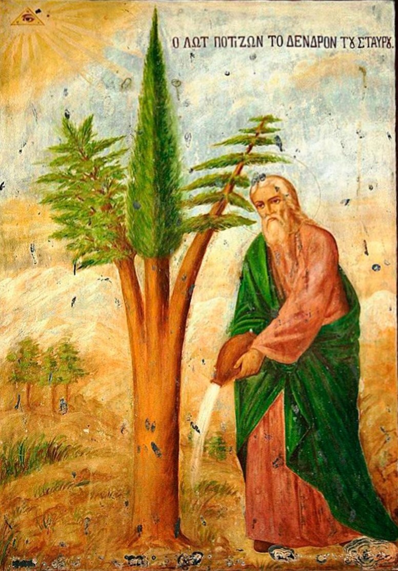 Само честное древо Креста Господня было осмыслено в сакральном смысле. В греческой, а позже и в древнеславянской агиографической литературе (например, русском апокрифе «Слово о Крестном Древе» XV—XVI века) возникло предание о трехсоставной материи восьмиконечного Креста распятия Христа: вертикальный столб был сделан из кипариса; поперечная перекладина, к которой прибили руки Иисуса Христа, была из певга (в славянском понимании – сосны), а «подножие» — планка, на которой стояли ноги Спасителя, значилась кедровой. Соотносилось это предание с ветхозаветным рассказом о посещении Пресвятой Троицей в образе трех Ангелов праотца Авраама в Хевроне. Божественные Посетители оставили у Мамврийского дуба три посоха из этих пород дерева, произраставших в Эдеме. После бессознательного кровосмесительного греха со своими дочерьми Лота – племянника Авраама, – тот обратился за советом к последнему, как ему искупить этот грех. И Авраам благословил ему поливать водой из Иордана три посоха, воткнутые в землю Ангелами, пока они не прорастут. Лот посадил эти посохи в долине, где ныне стоит монастырь Святого Креста в Иерусалиме и долго, борясь с искушениями от сатаны, ходил за водой на Иордан и поливал, пока они не дали побеги. Это было знамением того, что грех его прощен.