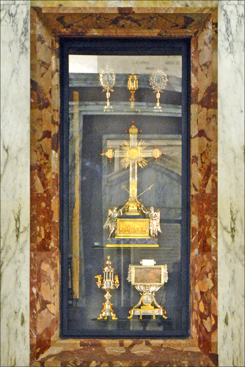 Реликварий церкви Санта-Кроче-ин-Джерусалемме, Рим, Италия. Включает в себя части Животворящего Креста, Титло и Гвозди Креста Господня, шипы из Тернового венца, палец апостола Фомы.