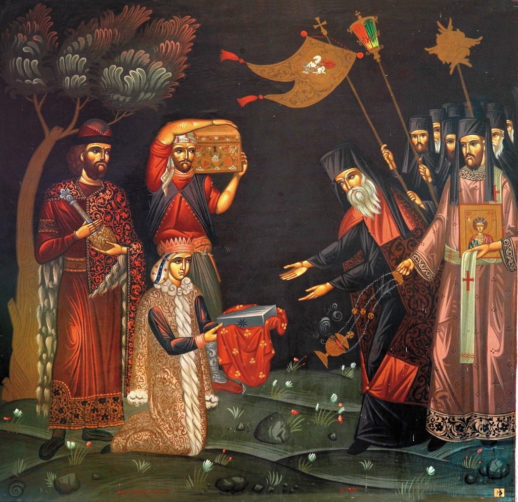 На том месте, где молилась Мара, и где состоялась передача святых даров, монахи поставили крест, именуемый Царицыным, а позже и часовню, фрески которой изображают это событие.
