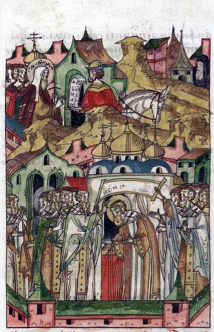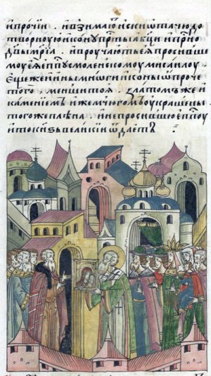 Святитель Иона передает Смоленскую икону Божией Матери епископу Мисаилу. Миниатюра Лицевого Летописного свода. XVI в.