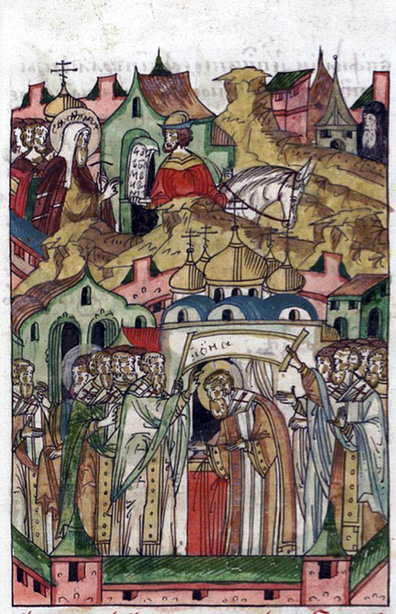 Поставление епископа Рязанского Ионы митрополитом всея Руси. Миниатюра Лицевого Летописного свода. XVI в.