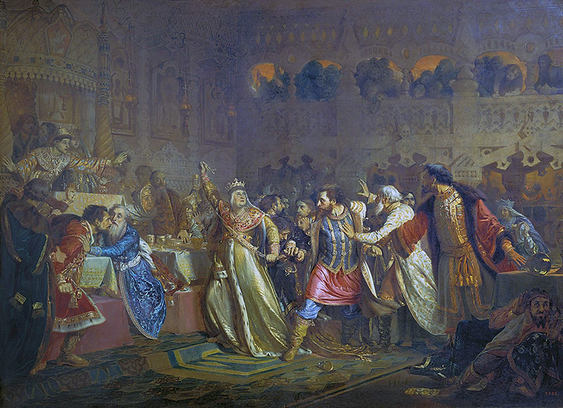 На свадьбе великого князя Василия Васильевича Тёмного великая княгиня Софья Витовтовна отнимает у князя Василия Косого, брата Шемяки, пояс с драгоценными каменьями, принадлежавший некогда Дмитрию Донскому, которым Юрьевичи завладели неправильно. Худ. П.П. Чистяков. 1861 г. Государственный Русский Музей.