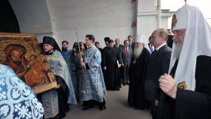 Избранный Президент России В.В. Путин и Патриарх Московский и всея Руси Кирилл встречают Иверскую икону в Новодевичьем монастыре 6 мая 2012 года