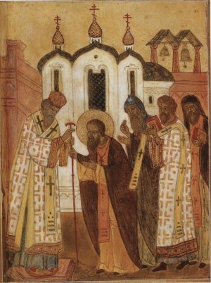 Поставление преподобного Корнилия в сан игумена. Клеймо иконы «Преподобномученик Корнилий в житии»
