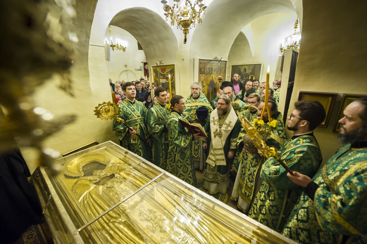 Митрополит Тихон (Шевкунов) у раки с мощами преподобномученика Корнилия Псково-Печерского