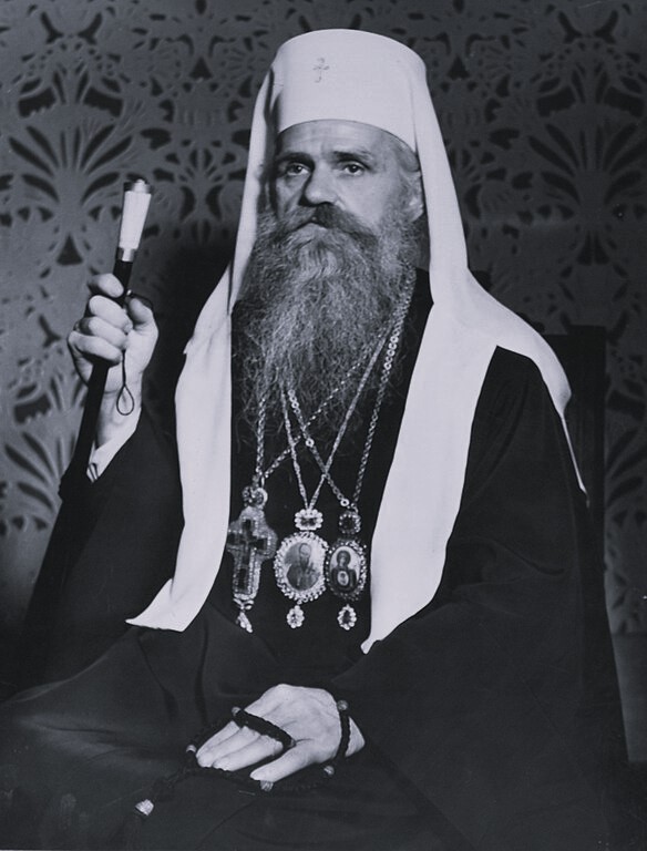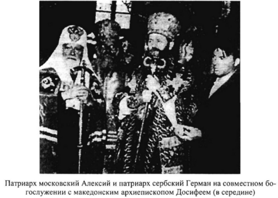 Патриарх Московский Алексий I и Патриарх Сербский Герман на совместном богослужении с македонским архиепископом Досифеем (в середине)