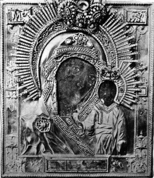 Каплуновская икона Божией Матери. Фотография оригинальной утраченной иконы из статьи старшего научного сотрудника ЦМДКИ им. Андрея Рублёва Н.Н. Чугреевой «Казанская Каплуновская икона Богоматери и победа под Полтавой» из сб. статей «Полтава. К 300-летию Полтавского сражения». М, 2009.