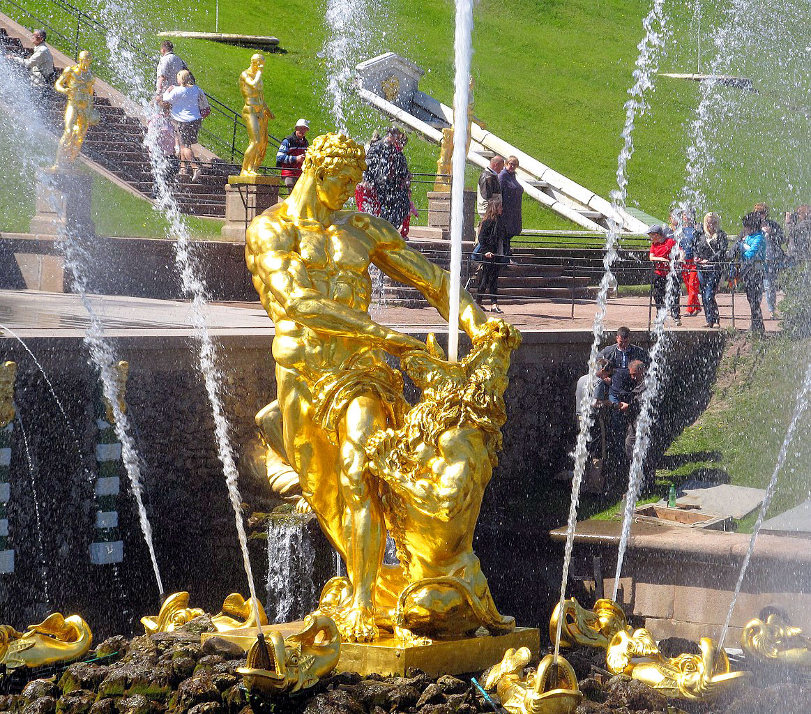 Самсон, разрывающий пасть льву, как аллегория победы России над Швецией под Полтавой в день святого Сампсона, в 25-ю годовщину битвы украсил центральный фонтан дворцово-паркового комплекса Петергофа.