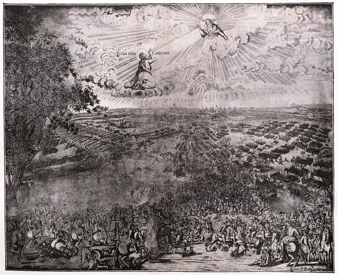 Преподобный Сампсон Странноприимец молится Богу о победе русской армии под Полтавой. Гравюра XIX века. С.В. Кульженко