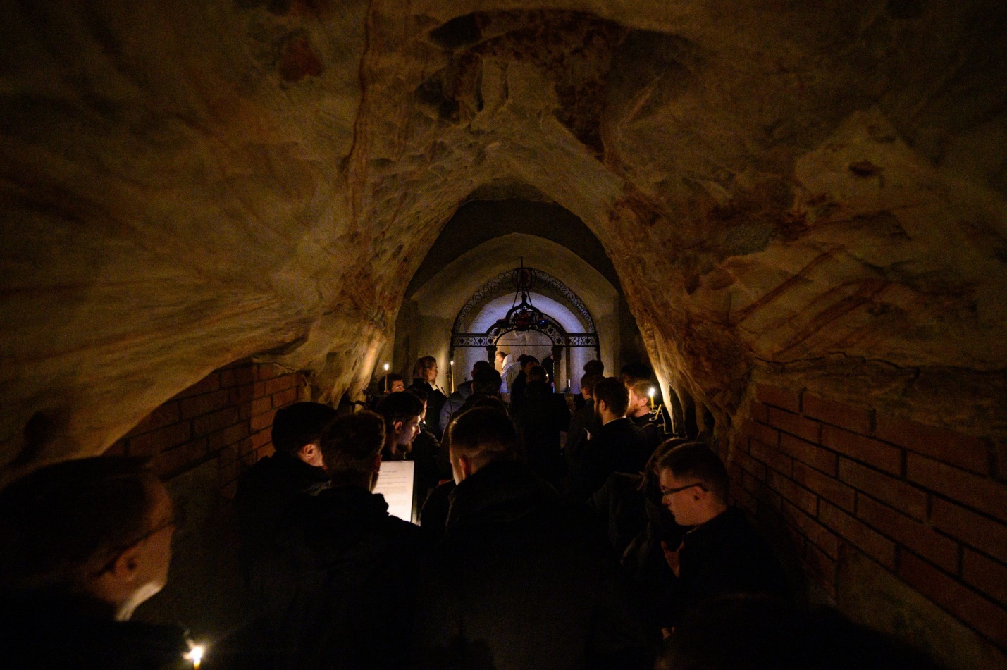 Студенты Псково-Печерской духовной семинарии принимают участие в ночной Божественной Литургии в Богозданных пещерах